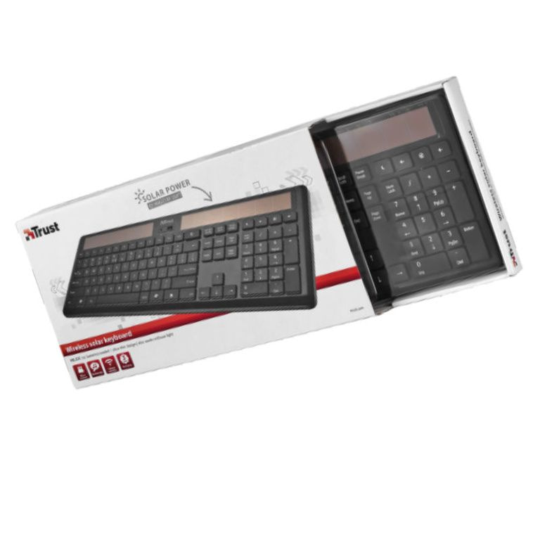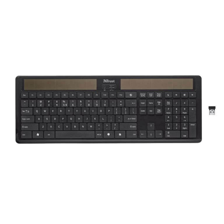 Trådløst tastatur med solceller; Lading gjøres ved sollys eller dagslys, så ingen batterier nødvendig.